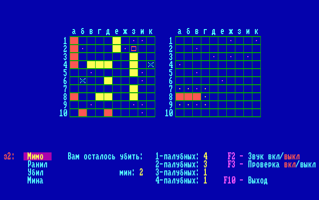 Логическая игра «Морской бой» с графическим интерфейсом. Можно выбирать различные размеры игрового поля по вертикали и горизонтали (от 1 до 17 клеток), наименьший и наибольший корабль (от 1 до 6 палуб), количество экземпляров для каждого корабля, тип расстановки и количество мин. Предусмотрена возможность сохранения настроек игры. Удар по кораблю наносится клавишей Enter, точки вокруг поверженных
