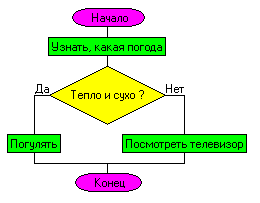 Разветвление. Очень часто в программах встречаются разветвления, то есть в зависимости от конкретной ситуации может выполняться либо одна последовательность команд, либо другая, либо третья, и так далее. Мы тоже так часто делаем. Например, если на улице сухо и тепло, идём гулять, а если дождь и