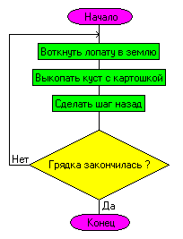 телом цикла. Здесь тоже можно привести пример из жизни – выкапывание картошки на огороде. Алгоритм здесь такой: воткнуть лопату в землю, выкопать куст с картошкой, сделать шаг назад, и снова то же самое, и снова, и снова, пока не закончится грядка. А вот – блок-схема:
