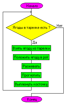 Тело этого цикла может не выполниться и ни разу (если ягод в тарелке изначально не было)... Очень часто начинающие программисты недоумевают, какой цикл в программе лучше исползовать: c предусловием или с постусловием. А ведь всё проще некуда. Нужно выяснить, должно ли тело цикла выполниться хотя бы один раз, или может не выполниться и ни разу. И всё станет ясно. А если не ясно – используй цикл с предусловием. Не ошибёшься.