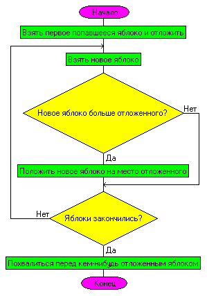 Теперь – более сложный пример: поиск максимального числа в массиве. Но сначала приведу пример из жизни. Пусть у нас имеется кучка яблок разных размеров. Как выбрать самое большое из них? Я бы поступил так. Взял бы первое попавшееся яблоко и отложил. Потом взял бы следующее яблоко из кучки и сравнил его с отложенным. Если новое окажется больше отложенного, то положил бы это новое на место отложенного. А если не больше, то ничего бы не делал. Потом взял бы следующее яблоко из кучки и проделал бы тоже самое (опять сравнил бы его с отложенным, и заменил бы отложенное им при необходимости). Это наше отложенное яблоко является ничем иным, как самым большим яблоком на данный момент проверки. А я продолжаю брать из кучки яблоки и сравнивать, производя при неоходимости замены. И так – пока не опустеет кучка. В итоге отложенным окажется самое большое яблоко. Вот – блок-схема алгоритма: