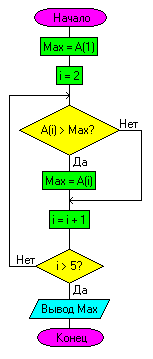 Введённая мною переменная Max – это и будет «отложенный» элемент, в этой переменной будет храниться максимальное на данный момент проверки число массива. Для начала присвоим Max значение первого элемента массива, т.е. 20. А i присваиваем значение 2. Почему 2? А потому что одно число из массива мы уже «отложили», и массив нужно проверять, начиная со второго элемента. Ну что ж, начинаем проверять. Производим сравнение A(i), т.е. A(2), с Max, который сейчас равен 20. A(2) равен 35, а это больше 20, поэтому выполняется присваивание «Маx = A(i)», т.е. «Max = 35», и Max теперь стал равен 35. Потом выполняется строчка «i = i + 1», и i становится равно 3. 3 < 5, поэтому мы возвращаемся назад, и начинается второй шаг цикла. Опять A(i) сравнивается с Max, но A(i) – уже 4, т.к. i сейчас – 3. 4 сравнивается с Max, который сейчас уже не 20, а 35. 4 меньше 35, поэтому команда "Max = A(i)" не выполняется, и Max остаётся равен 35. Теперь – опять "i = i + 1", i стало 4. Следующий шаг цикла. A(i), т.е. 67, сравнивается с x, который равен 35. 67 больше 35, поэтому выполняется "Max = A(i)", и x становится 67. Опять "i = i + 1", i стало 5. Опять A(i) сравнивается с Max, т.е. 48 сравнивается c 67. 48 меньше 67, "Max = A(i)" не выполняется, Max остаётся 67. И опять "i = i + 1", i теперь стало 6. Но 6 > 5, а цикл может выполняться, только когда i меньше или равно 5. Поэтому происходит выход из цикла, и выводится на экран Маx, т.е. 67 (максимальное число массива).