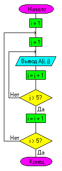 Здесь два цикла с постусловием, вложенные друг в друга. Кроме переменной i, есть ещё j. i cлужит для одного измерения, j – для другого. Если внимательно проследить по схеме за выполнением команд, то можно заметить, что элементы массива будут выводиться в следующем порядке: